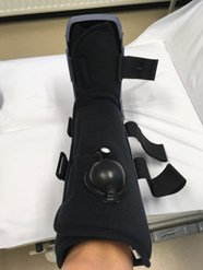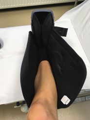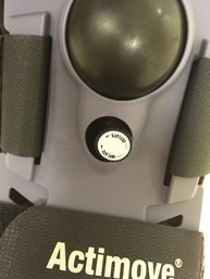 Pomp de luchtkamer in de binnenbekleding op. Zorg dat het ventiel op ‘inflate’ staat. Druk op de grote zwarte knop om lucht in de luchtkamer te pompen. Ga hiermee door totdat u stevig met uw enkel in de walker zit. U mag niet meer kunnen schuiven met uw hiel.